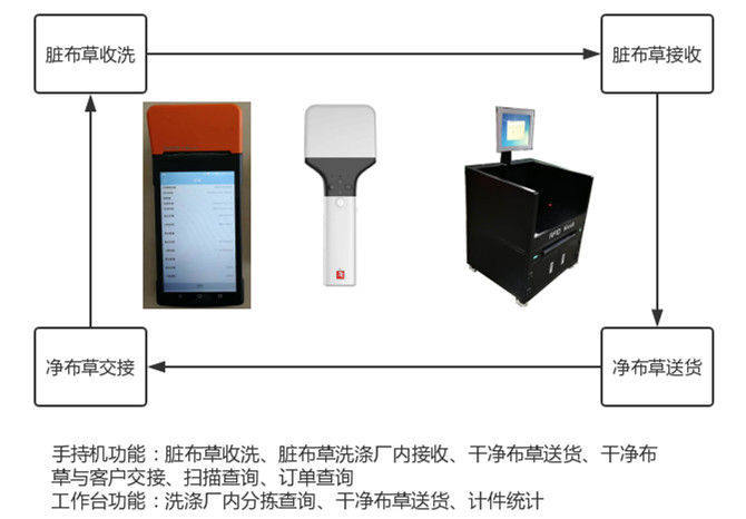 RFID手持机结合RFID工作台,可以进行收洗(脏布草)、送货(干净布草)所有流程。后台生成相应管理报表,包括洗涤费、租赁费、收洗单、送货单等。收洗脏布草读取空间比较小的地方,另外配备屏蔽罩,扫描时布草在屏蔽罩内机芯扫描,可以解决现场误读的问题,屏蔽罩对提高读取率也有一定的帮助。工作台在洗涤厂进行生产数据统计,计件管理,送货管理。